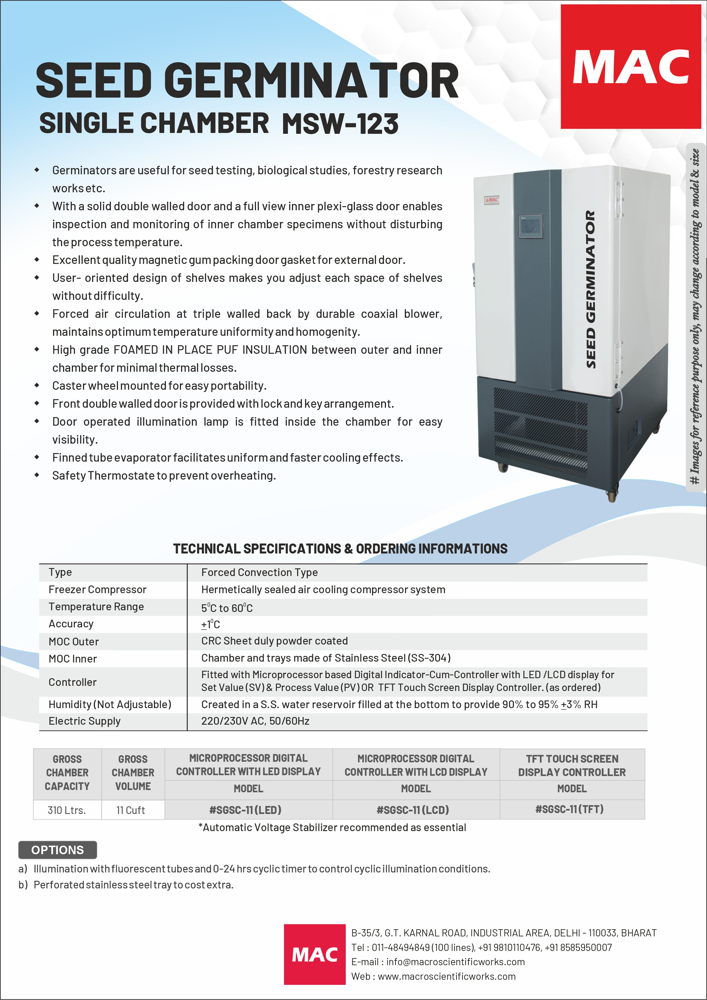 - Humidity (Not Adjustable) : Created in a S.S. water reservoir fitted at the bottom to provide 90% to 95% +3%RH
